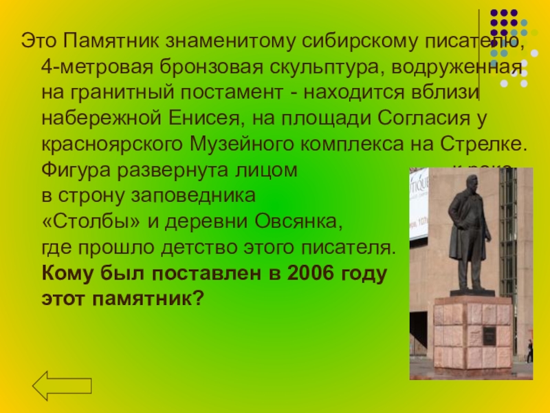 постамент - находится вблизи набережной Енисея, на площади Согласия у красноярского Музейного комплекса на Стрелке. Фигура развернута лицом к реке, в строну заповедника «Столбы» и деревни Овсянка, где прошло детство этого писателя. Кому был поставлен в 2006 году этот памятник?