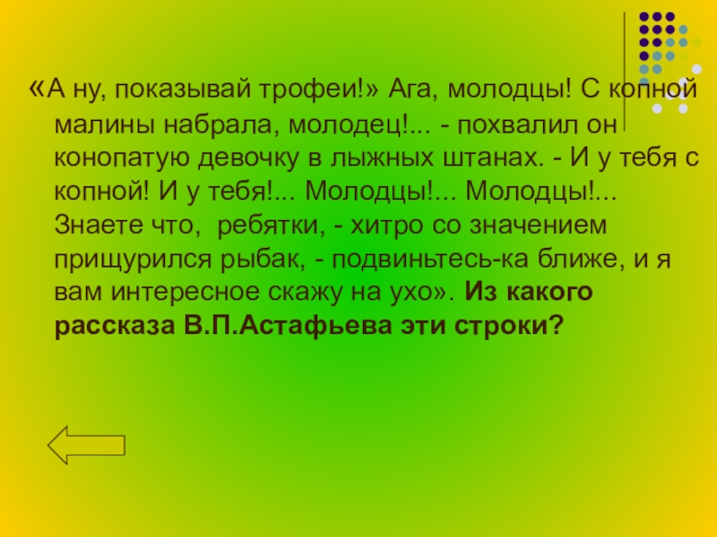 - похвалил он конопатую девочку в лыжных штанах. - И у тебя с копной! И у тебя!... Молодцы!... Молодцы!... Знаете что, ребятки, - хитро со значением прищурился рыбак, - подвиньтесь-ка ближе, и я вам интересное скажу на ухо». Из какого рассказа В.П.Астафьева эти строки?