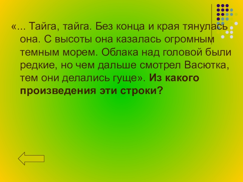 «Мальчик брел, почти падая от усталости. Неожиданно лес расступился, открыв перед Васюткой отлогий берег реки. Малыш застыл.