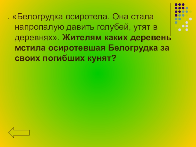 . «Белогрудка осиротела. Она стала напропалую давить голубей, утят в деревнях». Жителям каких деревень мстила осиротевшая Белогрудка