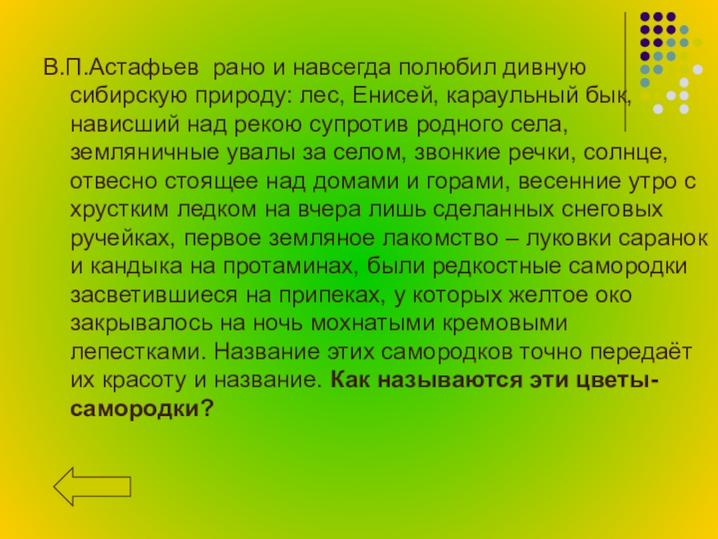 бык, нависший над рекою супротив родного села, земляничные увалы за селом, звонкие речки, солнце, отвесно стоящее над домами и горами, весенние утро с хрустким ледком на вчера лишь сделанных снеговых ручейках, первое земляное лакомство – луковки саранок и кандыка на протаминах, были редкостные самородки засветившиеся на припеках, у которых желтое око закрывалось на ночь мохнатыми кремовыми лепестками. Название этих самородков точно передаёт их красоту и название. Как называются эти цветы-самородки?