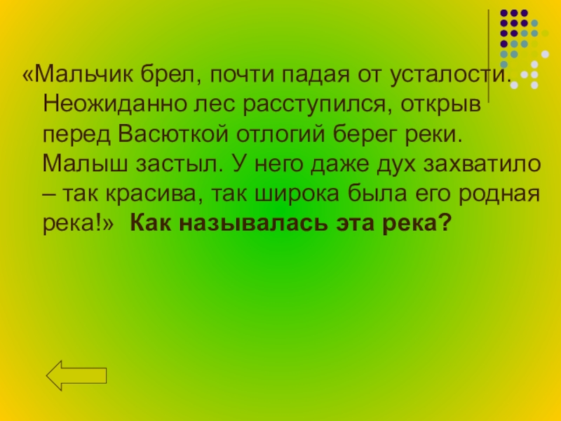 Васюткой отлогий берег реки. Малыш застыл. У него даже дух захватило – так красива, так широка была его родная река!»  Как называлась эта река?