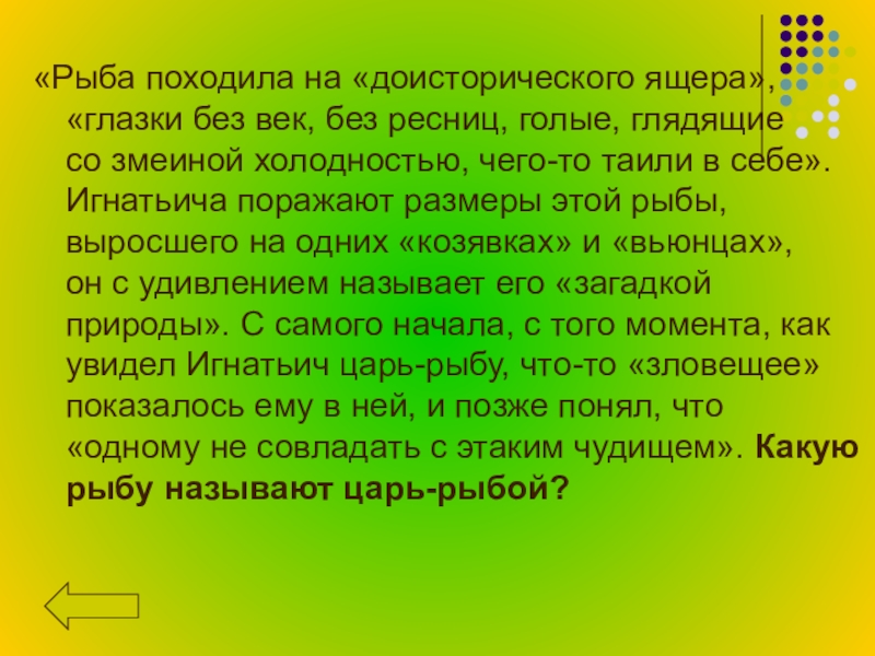 со змеиной холодностью, чего-то таили в себе». Игнатьича поражают размеры этой рыбы, выросшего на одних «козявках» и «вьюнцах», он с удивлением называет его «загадкой природы». С самого начала, с того момента, как увидел Игнатьич царь-рыбу, что-то «зловещее» показалось ему в ней, и позже понял, что «одному не совладать с этаким чудищем». Какую рыбу называют царь-рыбой?