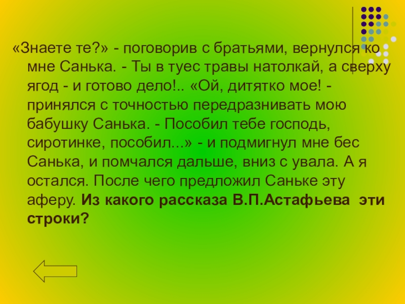 Ты в туес травы натолкай, а сверху ягод - и готово дело!.. «Ой, дитятко мое! - принялся с точностью передразнивать мою бабушку Санька. - Пособил тебе господь, сиротинке, пособил...» - и подмигнул мне бес Санька, и помчался дальше, вниз с увала. А я остался. После чего предложил Саньке эту аферу. Из какого рассказа В.П.Астафьева эти строки?