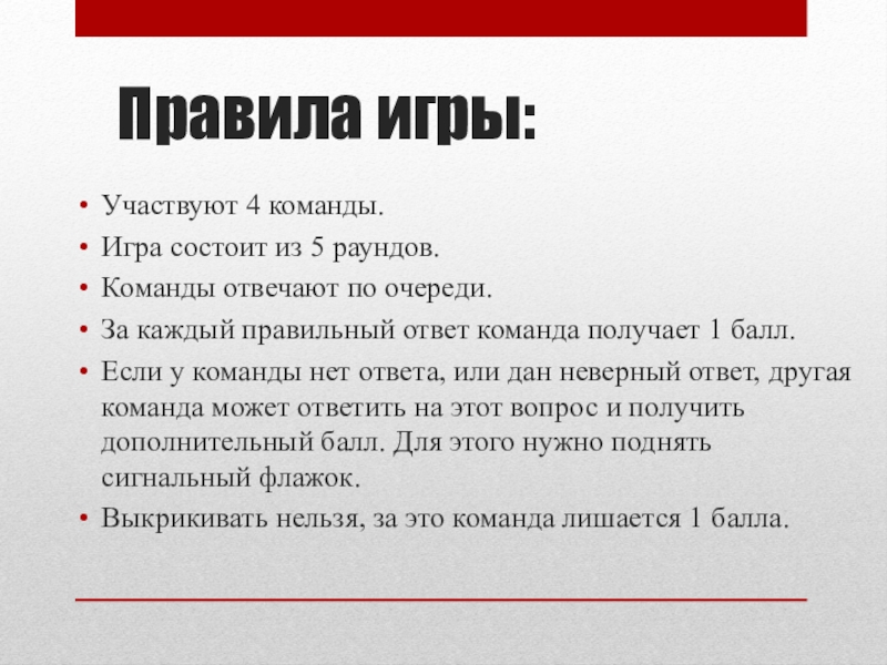 Если у команды нет ответа, или дан неверный ответ, другая команда может ответить на этот вопрос и получить дополнительный балл. Для этого нужно поднять сигнальный флажок.