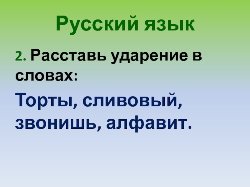 2. тОрты, слИвовый, звонИшь, алфавИт.
