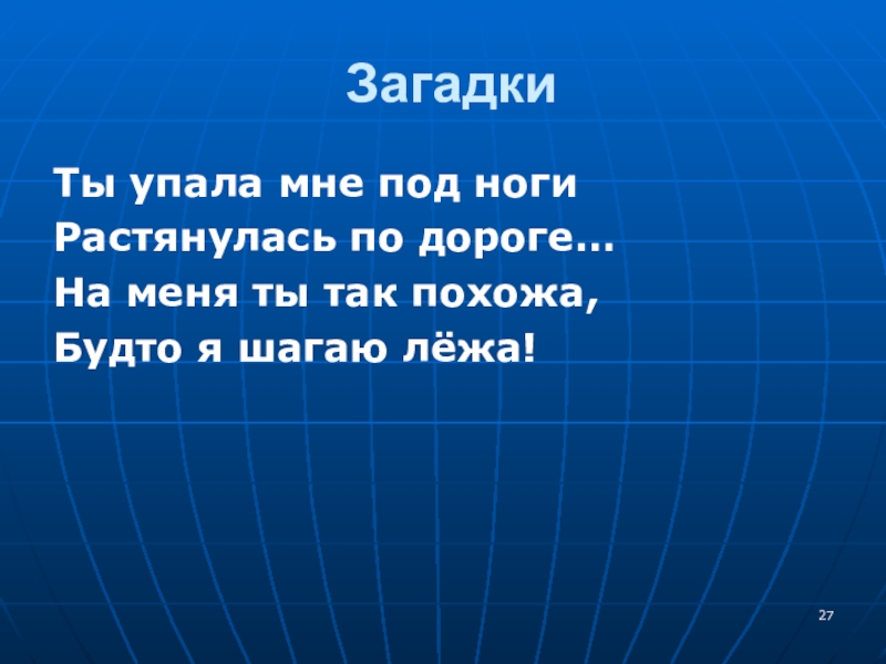 ЗагадкиТы упала мне под ногиРастянулась по дороге…На меня ты так похожа,Будто я шагаю лёжа!