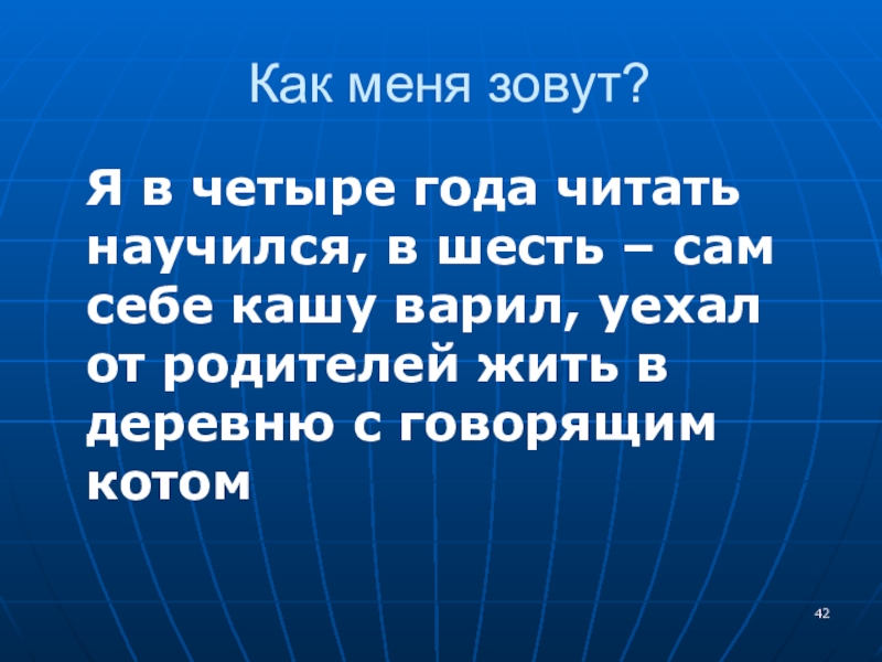 Как меня зовут? Я в четыре года читать научился, в шесть – сам себе кашу варил, уехал