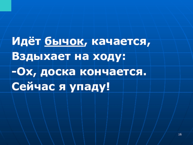 Идёт бычок, качается, Вздыхает на ходу:-Ох, доска кончается.Сейчас я упаду!