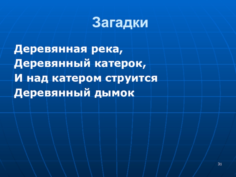 ЗагадкиДеревянная река,Деревянный катерок,И над катером струитсяДеревянный дымок