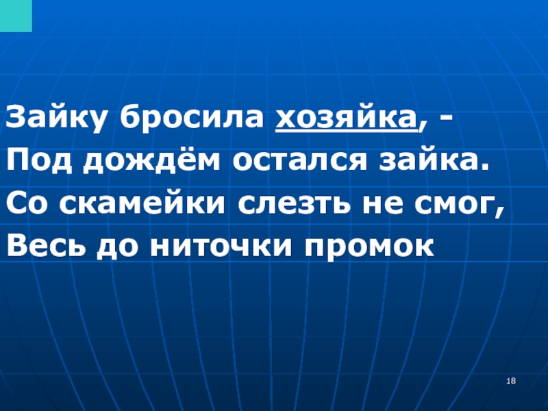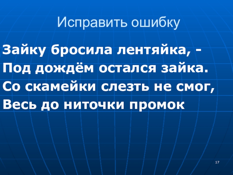 Исправить ошибку Зайку бросила лентяйка, -Под дождём остался зайка.Со скамейки слезть не смог, Весь до ниточки промок