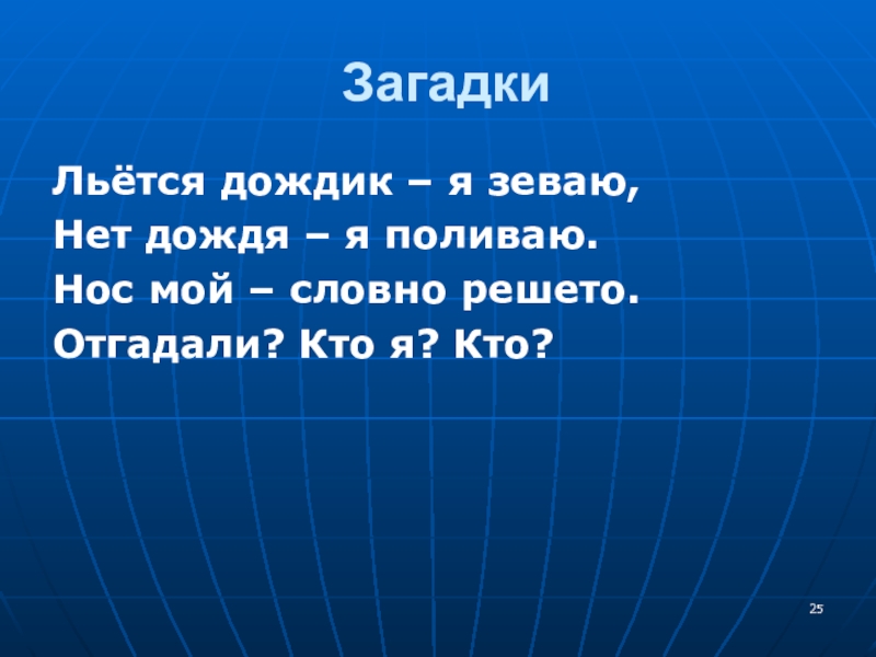 ЗагадкиЛьётся дождик – я зеваю,Нет дождя – я поливаю.Нос мой – словно решето.Отгадали? Кто я? Кто?