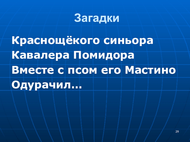 ЗагадкиКраснощёкого синьораКавалера ПомидораВместе с псом его МастиноОдурачил…