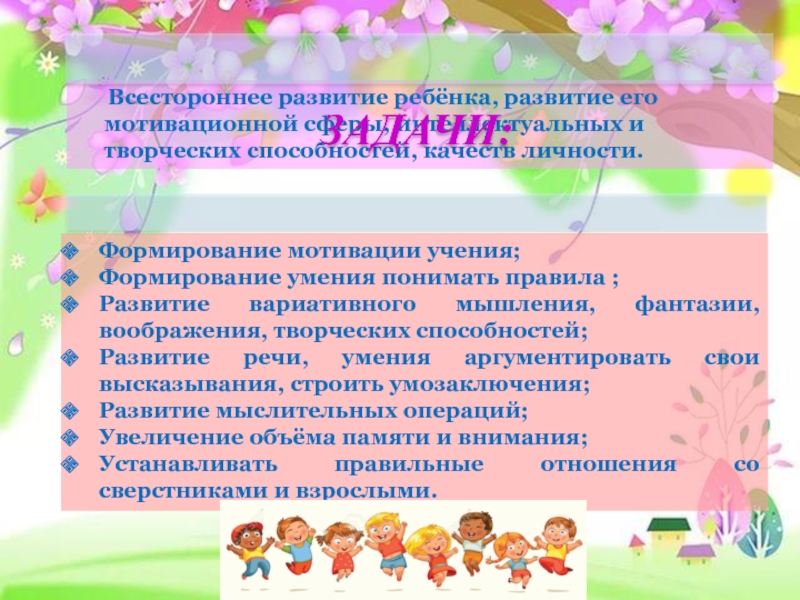 Всестороннее развитие ребёнка, развитие его мотивационной сферы, интеллектуальных и творческих способностей, качеств личности.