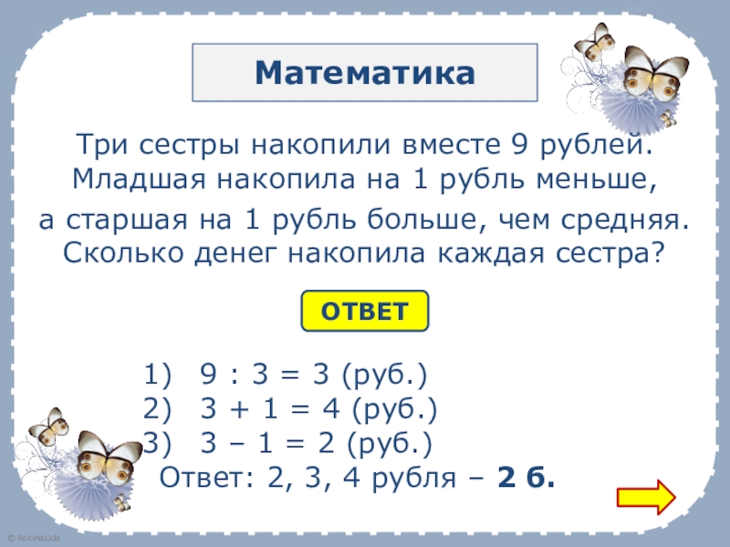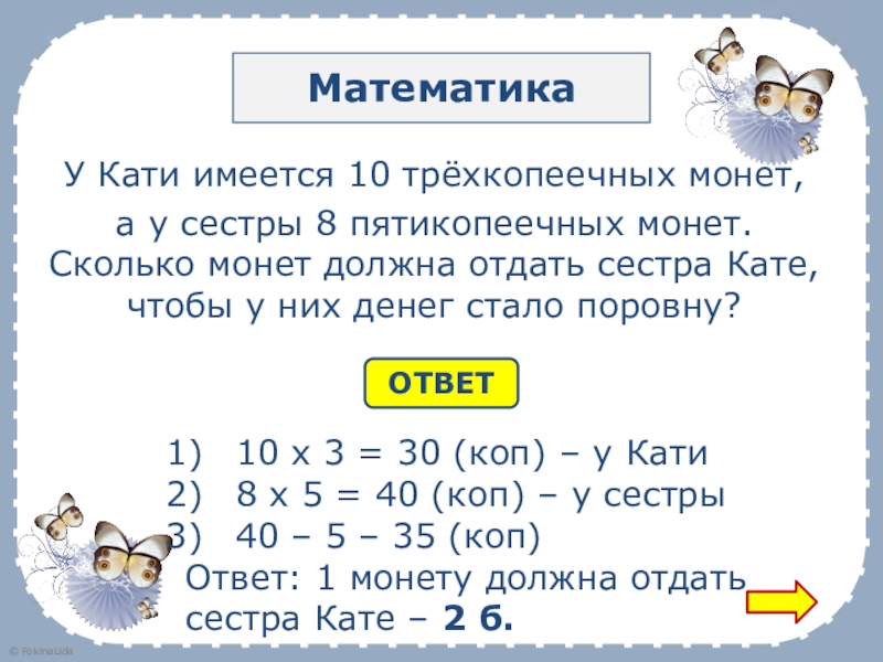 Ответ: 1 монету должна отдать сестра Кате – 2 б.