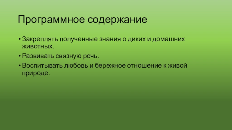 Программное содержаниеЗакреплять полученные знания о диких и домашних животных.Развивать связную речь.Воспитывать любовь и бережное отношение к живой природе.