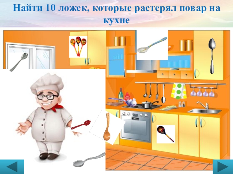 Слайд 7Найти 10 ложек, которые растерял повар на кухне