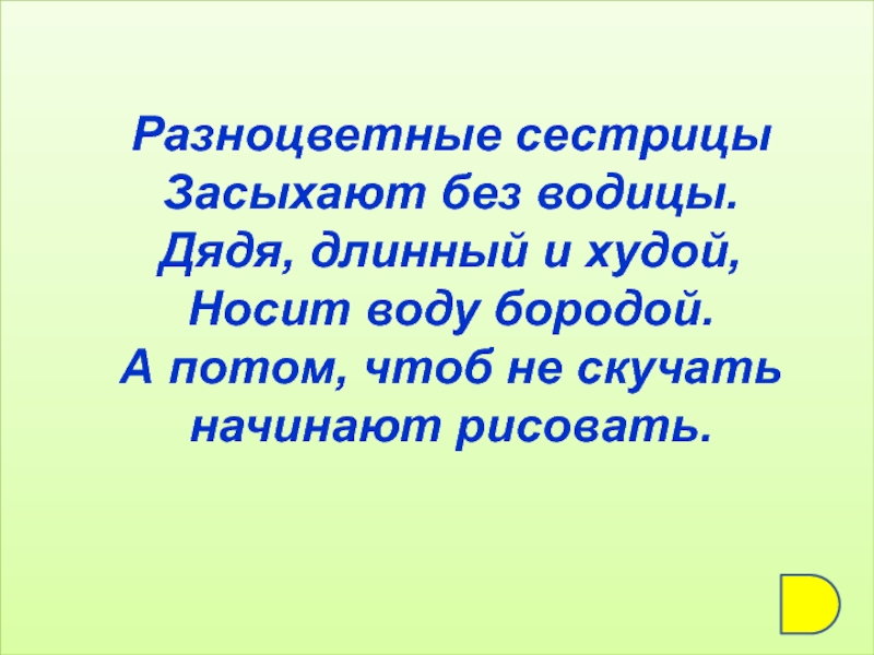 Слайд 10Разноцветные сестрицы Засыхают без водицы. Дядя, длинный и худой, Носит воду бородой. А потом,