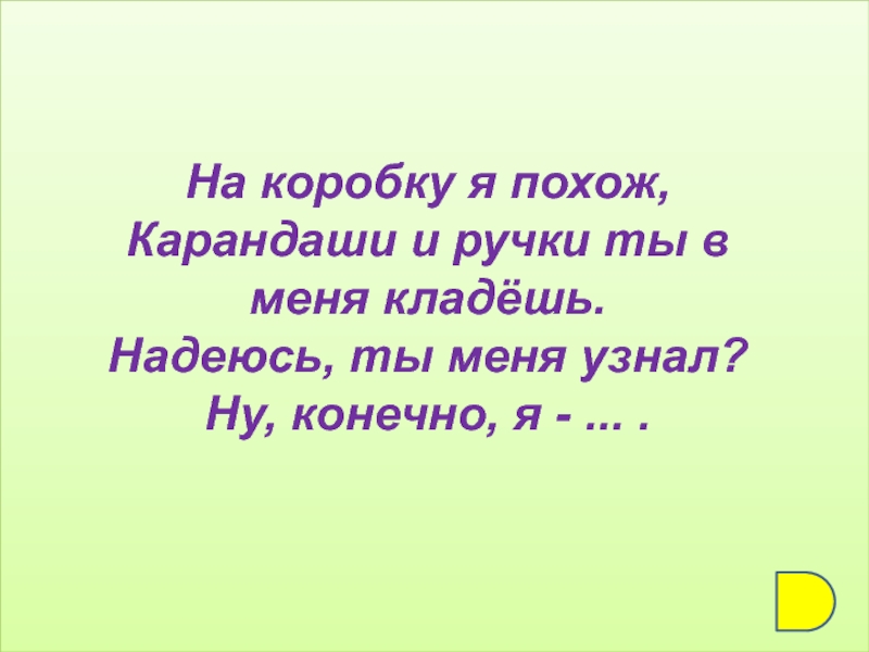 Слайд 8На коробку я похож, Карандаши и ручки ты в меня кладёшь. Надеюсь, ты