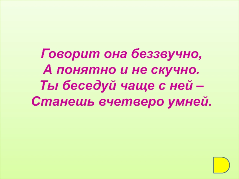 Говорит она беззвучно, А понятно и не скучно. Ты беседуй чаще с ней – Станешь вчетверо умней.