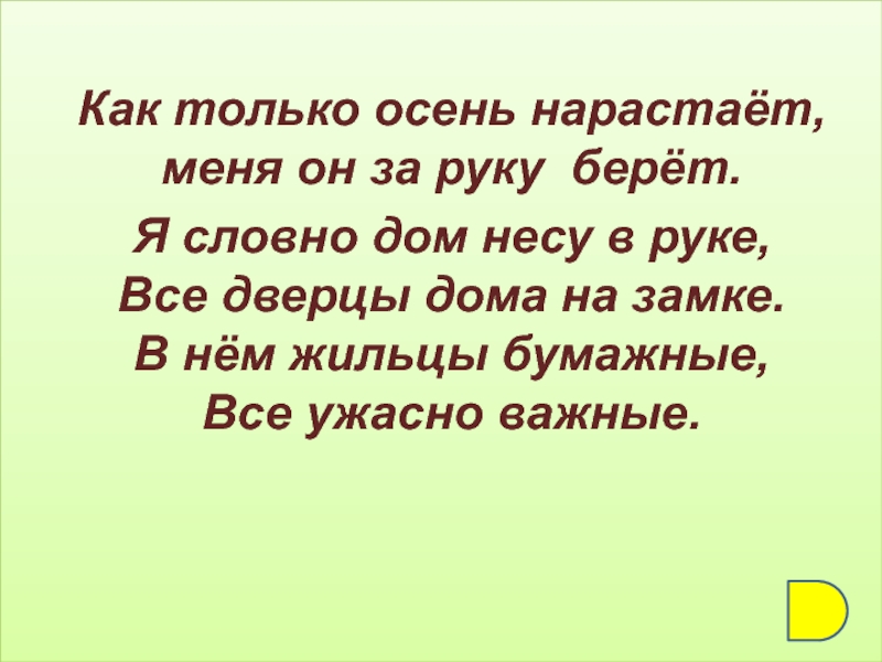 Как только осень нарастаёт,  меня он за руку берёт.  Я словно дом несу в руке,  Все дверцы