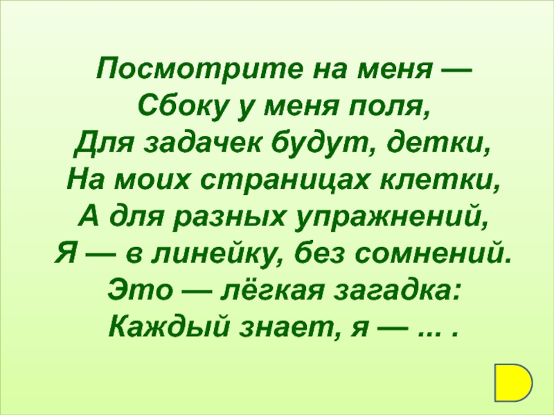 Посмотрите на меня — Сбоку у меня поля, Для задачек будут, детки, На моих страницах клетки, А