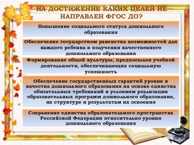 НА ДОСТИЖЕНИЕ КАКИХ ЦЕЛЕЙ НЕ НАПРАВЛЕН ФГОС ДО?