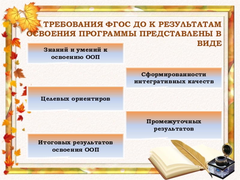 ТРЕБОВАНИЯ ФГОС ДО К РЕЗУЛЬТАТАМ ОСВОЕНИЯ ПРОГРАММЫ ПРЕДСТАВЛЕНЫ В ВИДЕ