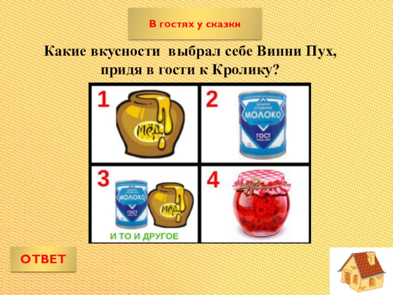 В гостях у сказкиОТВЕТКакие вкусности выбрал себе Винни Пух, придя в гости к Кролику?