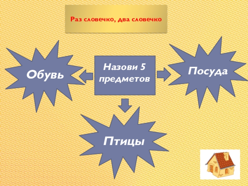 Раз словечко, два словечкоОбувьПтицыПосудаНазови 5 предметов