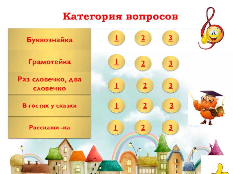 Категория вопросовБуквознайкаРасскажи -ка123122113332В гостях у сказки231ГрамотейкаРаз словечко, два словечко