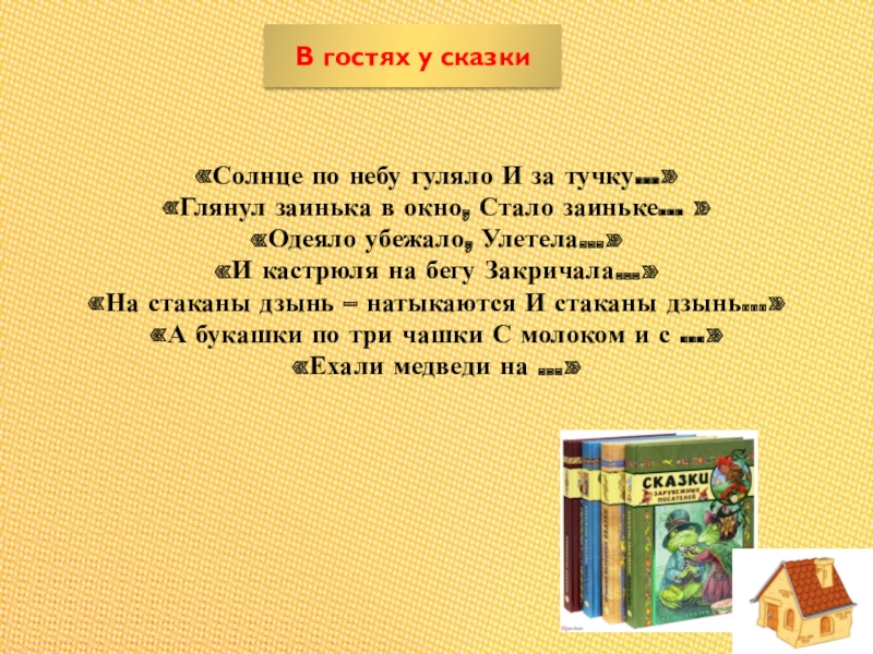 В гостях у сказки«Солнце по небу гуляло И за тучку…»«Глянул заинька в окно, Стало заиньке… »«Одеяло убежало,
