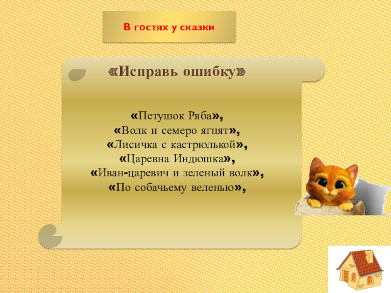 В гостях у сказкиВопрос: Из какой сказки отрывок?«Исправь ошибку»«Петушок Ряба»,  «Волк и семеро ягнят»,«Лисичка с кастрюлькой»,«Царевна