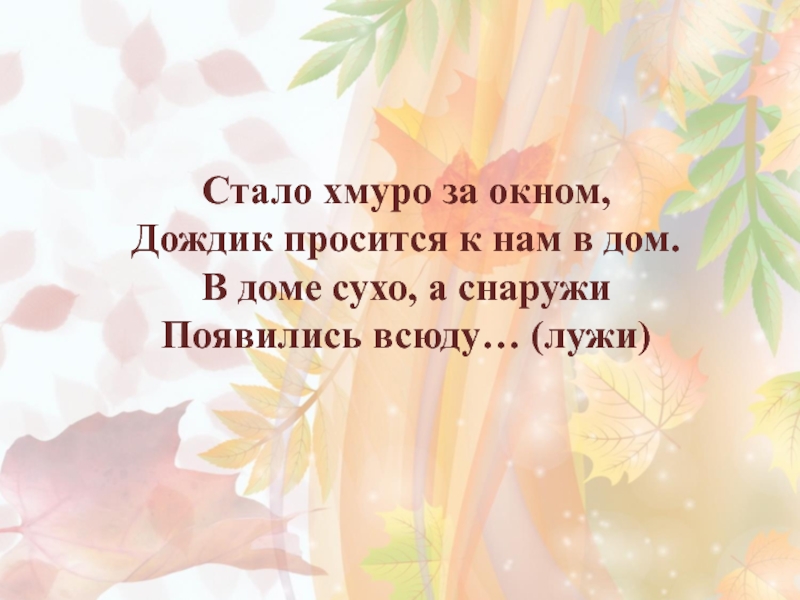 Стало хмуро за окном, Дождик просится к нам в дом. В доме сухо, а снаружи Появились всюду…