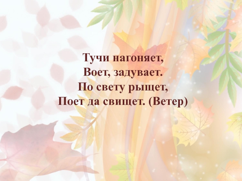 Тучи нагоняет, Воет, задувает. По свету рыщет, Поет да свищет. (Ветер)