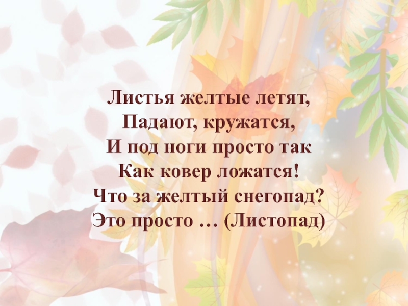 Листья желтые летят, Падают, кружатся, И под ноги просто так Как ковер ложатся! Что за желтый снегопад?