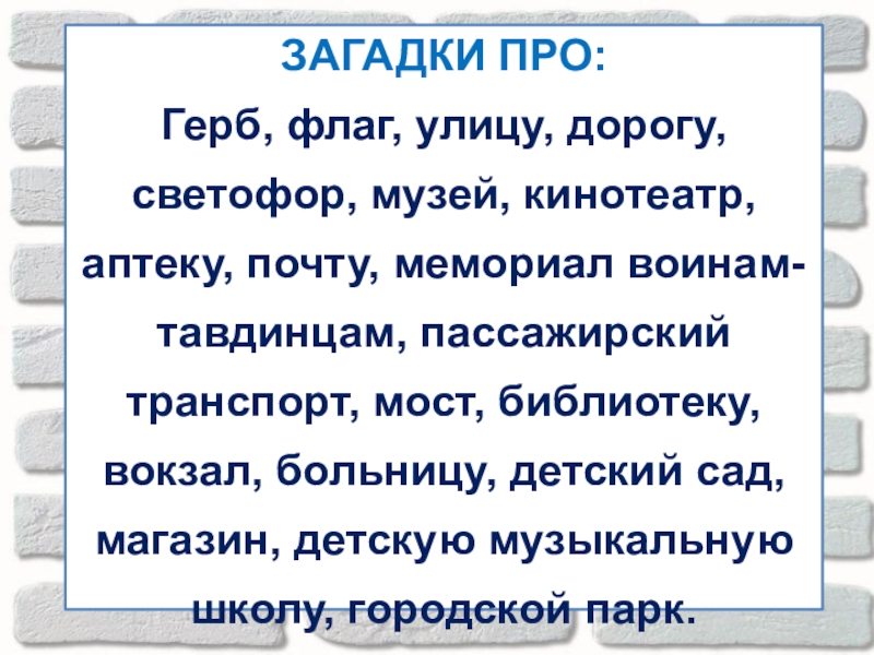 Герб, флаг, улицу, дорогу, светофор, музей, кинотеатр, аптеку, почту, мемориал