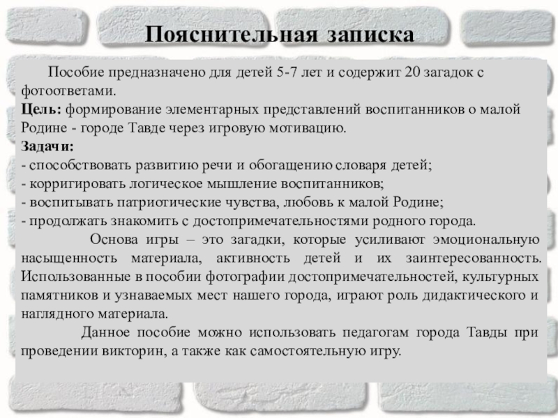 Основа игры – это загадки, которые усиливают эмоциональную насыщенность материала, активность детей и их заинтересованность. Использованные в пособии фотографии достопримечательностей, культурных памятников и узнаваемых мест нашего города, играют роль дидактического и наглядного материала.