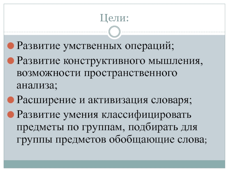 Цели:Развитие умственных операций;Развитие конструктивного мышления, возможности пространственного анализа;Расширение и активизация словаря;Развитие умения классифицировать предметы по группам, подбирать