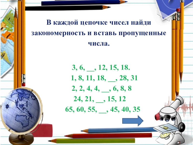 Слайд 11В каждой цепочке чисел найди закономерность и вставь пропущенные числа.