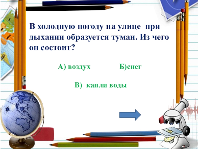 В холодную погоду на улице  при дыхании образуется туман. Из чего он состоит?              А) воздух               Б)снег              В)  капли воды