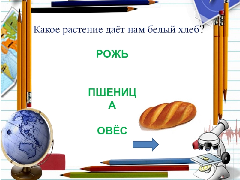 Какое растение даёт нам белый хлеб?РОЖЬ  ПШЕНИЦА ОВЁС
