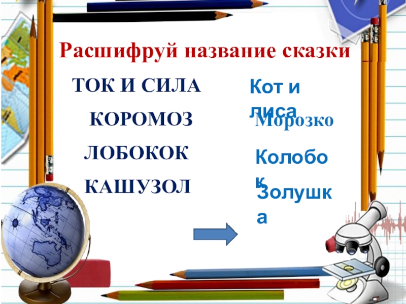 Расшифруй название сказки   ТОК И СИЛА    КОРОМОЗ   ЛОБОКОК   КАШУЗОЛ