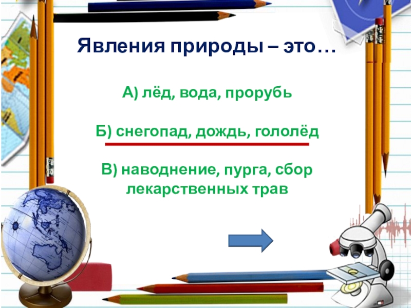 Явления природы – это…   А) лёд, вода, прорубь   Б) снегопад, дождь, гололёд