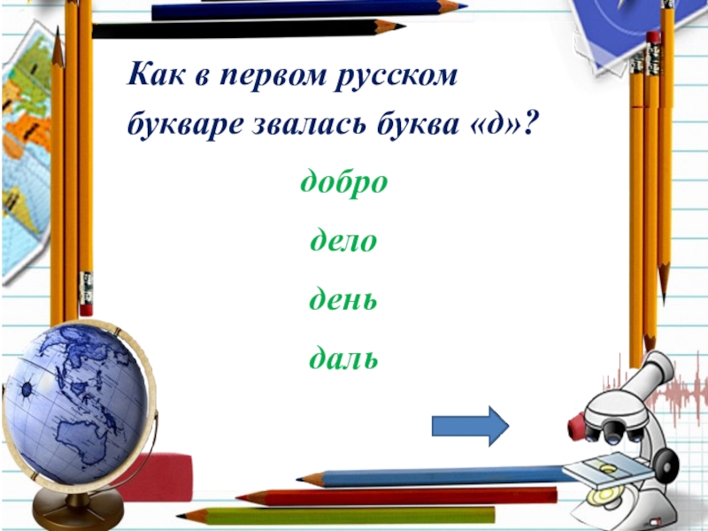 Как в первом русском букваре звалась буква «д»? добро дело день даль