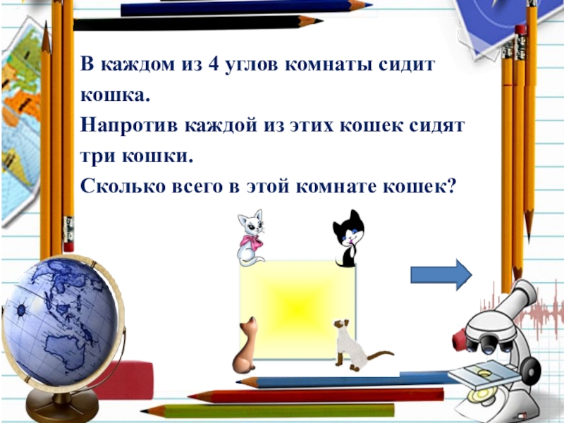 Слайд 9В каждом из 4 углов комнаты сидит кошка. Напротив каждой из этих