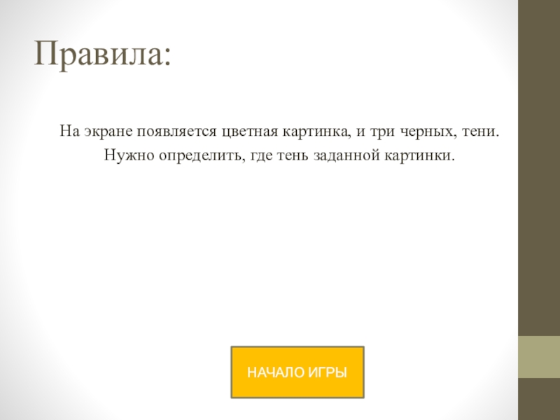 Правила:На экране появляется цветная картинка, и три черных, тени. Нужно определить, где тень заданной картинки.НАЧАЛО ИГРЫ
