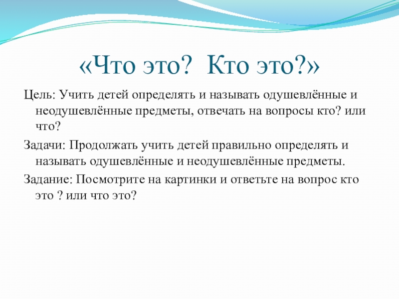 «Что это? Кто это?»Цель: Учить детей определять и называть одушевлённые и неодушевлённые предметы, отвечать на вопросы кто? или что?Задачи: Продолжать учить детей правильно определять и называть одушевлённые и неодушевлённые предметы.Задание: Посмотрите на картинки и ответьте на