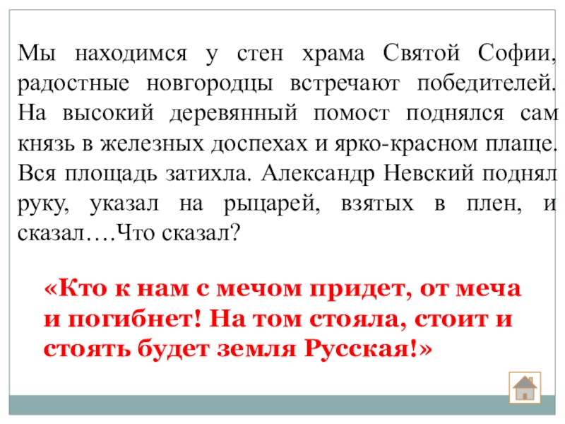 «Кто к нам с мечом придет, от меча и погибнет! На том стояла, стоит и стоять будет земля Русская!»