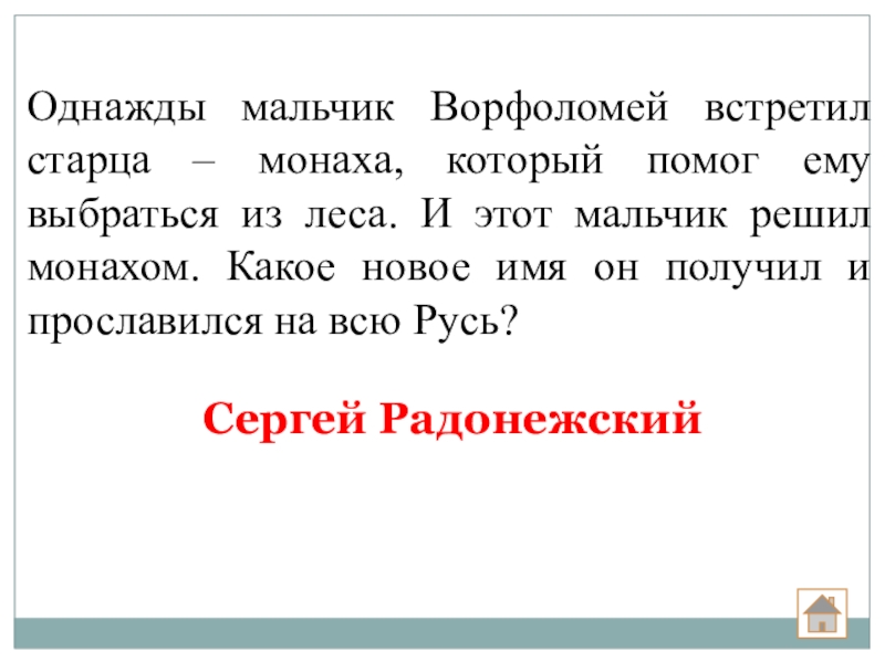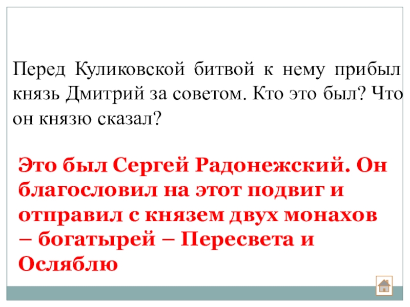 Это был Сергей Радонежский. Он благословил на этот подвиг и отправил с князем двух монахов – богатырей – Пересвета и Осляблю